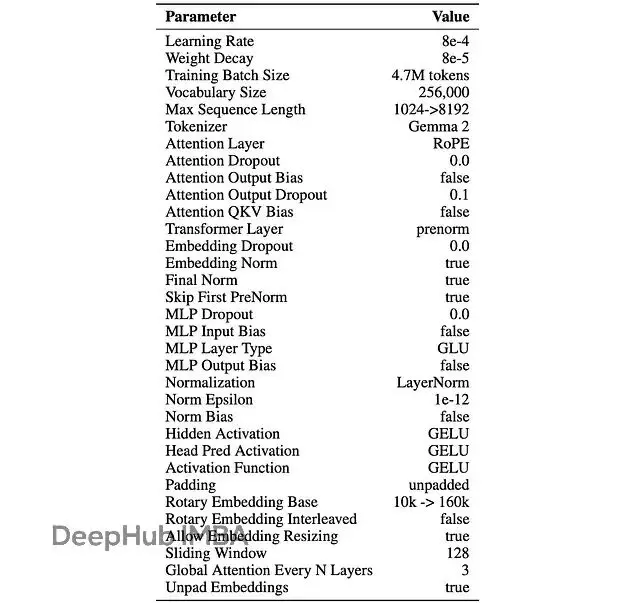 整體架構和ModernBERT保持一致,但換成了Gemma 2的tokenizer來處理多語言輸入。base和small兩個版本都用了22層網絡,中間維度是1152(這點和ModernBERT-base一樣),區別在隱藏層維度上:base是768,small則縮減到384。