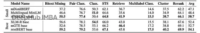 從參數量來看,base版本的非嵌入參數跟ModernBERT-base持平,都是110M,但因為詞表擴大了,總參數量達到307M。small版本總共140M參數,其中非嵌入部分42M。