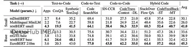 CoIR基準測試中,mmBERT base平均42.2分,遠超XLM-R(33.6)這類大規模多語言模型。不過沒跑過EuroBERT-210m(45.3),估計是因為EuroBERT用了更高質量的非公開訓練數據。