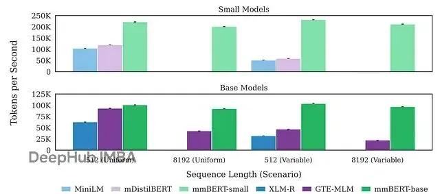 mmBERT模型比以往的多語言編碼器模型快得多、效率也高得多。base版本在可變序列上快了2倍多,長上下文快了約4倍。small版本大概是base的2倍速度,也比其他同規模多語言模型快2倍。