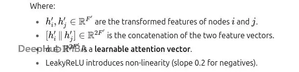 GAT計算注意力之前,需要先對節點特徵進行線性變換。這一步用共享的權重矩陣W將原始特徵投影到新的特徵空間。