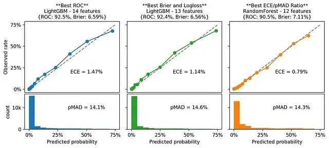 三個模型的pMAD相近,但ECE差異明顯。而且從12個特徵增加到14個,ROC-AUC提升了,但校準變差了。