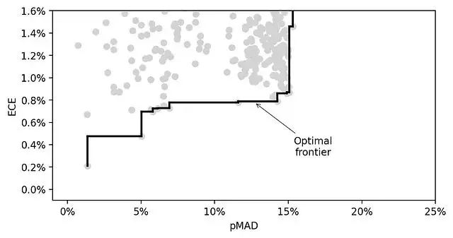 最優前沿(optimal frontier)定義為:在這條線上的模型,不存在其他模型同時擁有更低的ECE和不低於它的pMAD。
