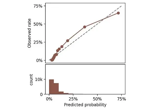 完美校準的模型,曲線應該貼着45度對角線。比如某個區間平均預測概率是25%,那這個區間裏實際正例比例也該是25%。曲線偏離對角線越遠説明校準越差。