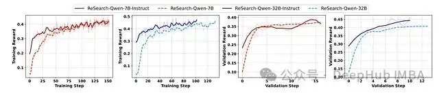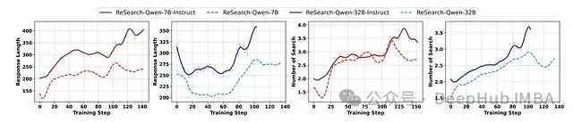 - 響應長度呈增長趨勢:響應長度在訓練過程中普遍呈現增長趨勢,指令微調模型生成的響應通常長於基礎模型。32B規模模型展現了獨特的模式,初始階段響應長度下降,隨後再次上升,這可能反映了模型從依賴固有知識到有效利用檢索結果的學習過程轉變。