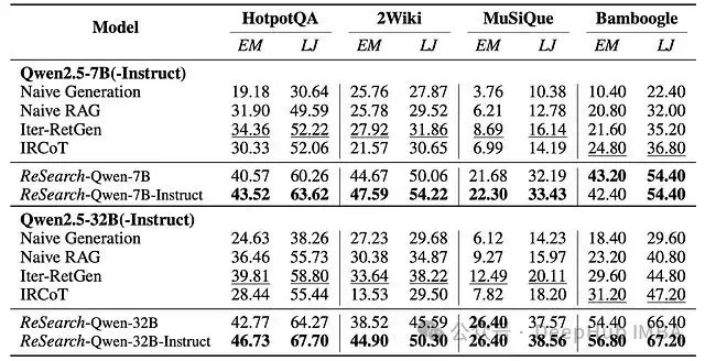 研究團隊在Qwen2.5–7B、Qwen2.5–7B-Instruct、Qwen2.5–32B和Qwen2.5–32B-Instruct模型上進行了訓練與評估。訓練僅使用MuSiQue的訓練集(19,938個樣本),該數據集包含多種類型的多跳問題,並經過嚴格的質量控制構建。模型訓練週期為2個完整週期。