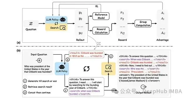 標籤來封裝檢索結果,這些格式規範在提示模板中明確定義。整個推理過程構成了基於文本的思考、搜索查詢和檢索結果之間的迭代循環。具體實現中,當生成過程遇到