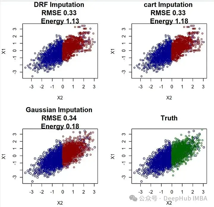 所以如果我遇到一個缺失值問題,可以首先嚐試的是mice-cart或在論文中開發的新方法mice-DRF。它們重現數據的能力非常驚人。但是這些方法需要至少一箇中等的樣本大小,例如超過200或300。如果在少於200個觀察的情況下,可以選擇更簡單的方法,如高斯插補。如果你想從這些方法中找到最好的,可以嘗試使用論文中的評分規則來找到最好的方法。