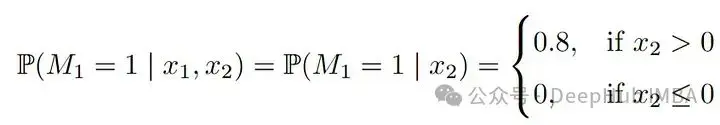 當X_2(年齡)較大(即大於0)時,X_1(收入)缺失的概率為0.8。由於我們假設X_2總是被觀察到,這是一個教科書式的MAR示例,它有兩種模式,一種是所有變量都被完全觀察到(m1),另一種是(m2),其中X_1缺失。儘管這個例子很簡單,但如果我們假設年齡越大,收入越高,那麼從一種模式轉換到另一種模式時,收入和年齡的分佈就會發生明顯的變化。在模式m2中,收入缺失,觀察到的年齡和(未觀察到的)收入的值都趨向於更高。