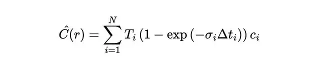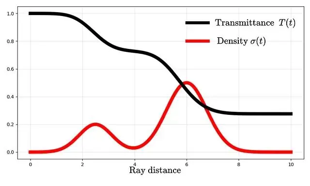 密度σ描述的是某點對光線的阻擋程度,可以理解為吸收概率。更嚴格地説它是光線在該點終止的微分概率。根據這個定義,光線從t傳播到tₙ的透射概率可以表示為: