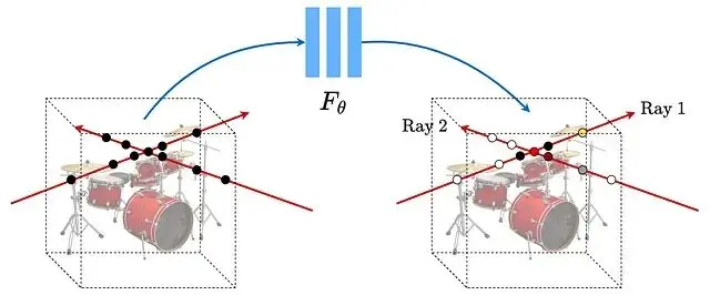 均勻採樣的問題在於大量計算浪費在空曠區域。分層採樣的思路是訓練兩個網絡,一個粗糙一個精細。