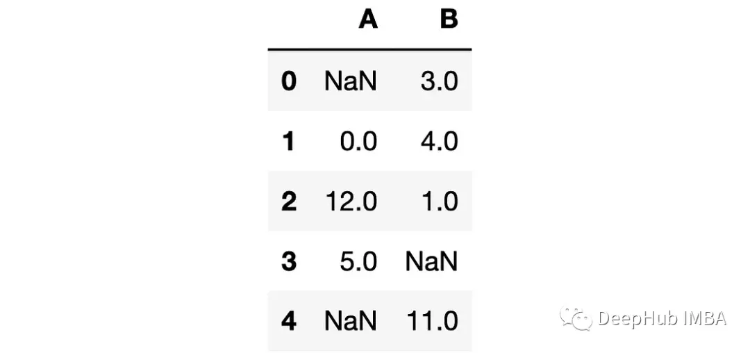 df2=pd.DataFrame({'A': [10, np.nan, 30, 40], 'B': [50, 60, np.nan, 80]}, index=['a', 'b', 'c', 'd'])