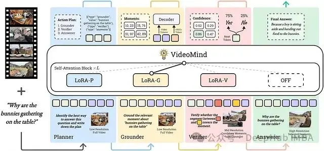 通過 Chain-of-LoRA 機制結合這些專業角色,VideoMind 實現了一個複雜的推理過程,該過程直接解決了長視頻中時間定位的挑戰。
