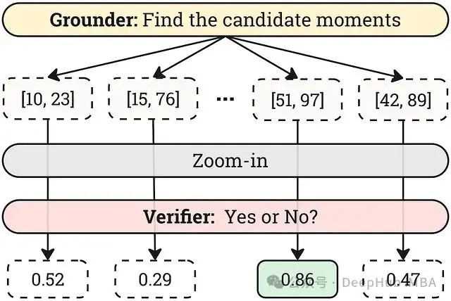 - Verifier(驗證器): 事實核查員,負責獲取 Grounder 識別出的候選時刻,並仔細檢查它們,以確認它們的準確性和相關性。