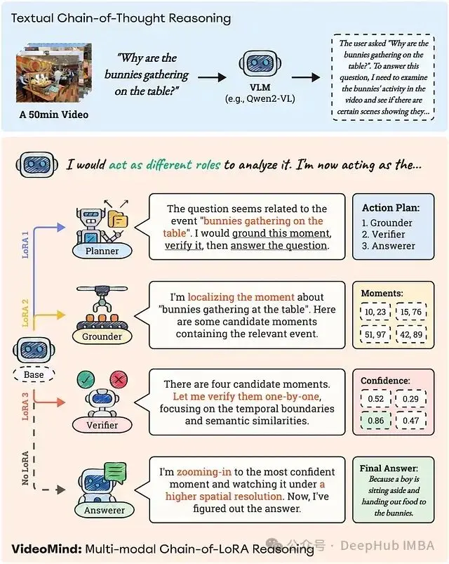VideoMind 的核心創新在於 Chain-of-LoRA,它能夠在沒有運行四個獨立的、大型 AI 模型開銷的情況下高效地實現這些角色的協作。