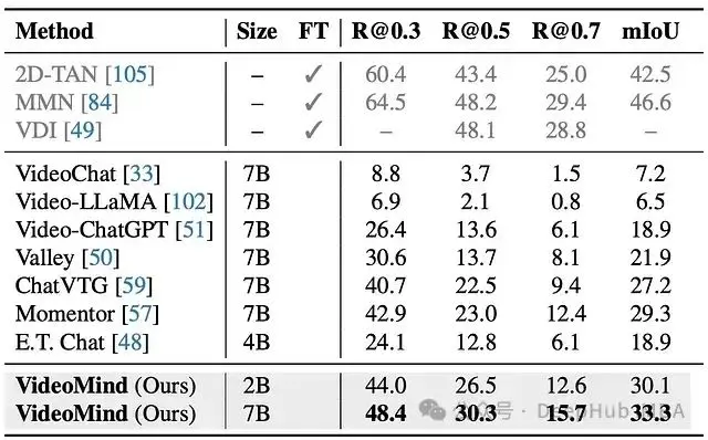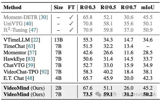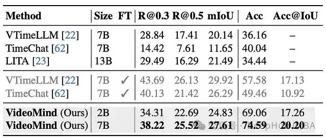 - 強大的泛化能力: 在 ReXTime 上,VideoMind 展示了出色的零樣本性能,優於其他零樣本模型,甚至超過了已在該任務上進行微調的幾個模型。