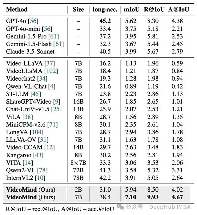 - 在長視頻定位中的優勢: 在具有挑戰性的長視頻定位 QA 基準(如 CG-Bench)上,VideoMind 明顯優於以前的開源模型。值得注意的是,VideoMind 的 7B 參數版本超過了更大的閉源 GPT-4o 的定位性能,甚至輕量級 2B VideoMind 模型在定位指標方面也與許多更大的模型具有競爭力或更好。