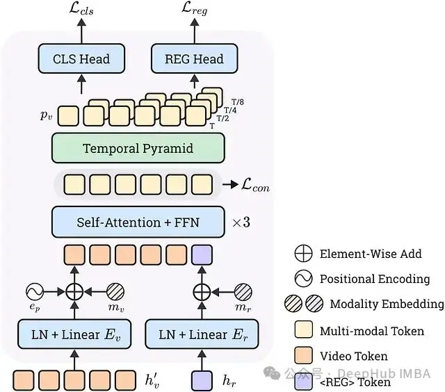 - 集成 Transformer: 在將可學習的模態嵌入 (mr, mv) 和正弦位置編碼 (ep) 添加到幀嵌入後,將投影的查詢嵌入 (er) 和幀嵌入 (ev) 連接起來。此組合序列 [ev + mv + ep; er + mr] 通過標準 Transformer 編碼器饋送。