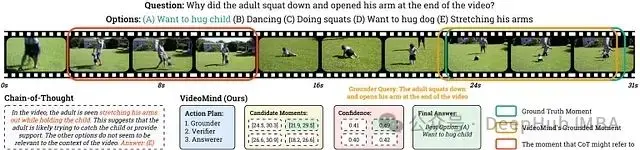 圖 3:VideoMind 工作流程的可視化。Planner 首先確定對函數調用的需求,並使用 Grounder 生成多個候選時刻。然後,它應用 Verifier 來選擇最相關的視頻片段(以黃色突出顯示)。放大後,該片段將傳遞給 Answerer。通過鏈接 Grounder、Verifier 和 Answerer 角色,VideoMind 可以準確定位關鍵時刻並選擇正確的答案,從而避免了來自不正確片段的混淆(紅色框)。
