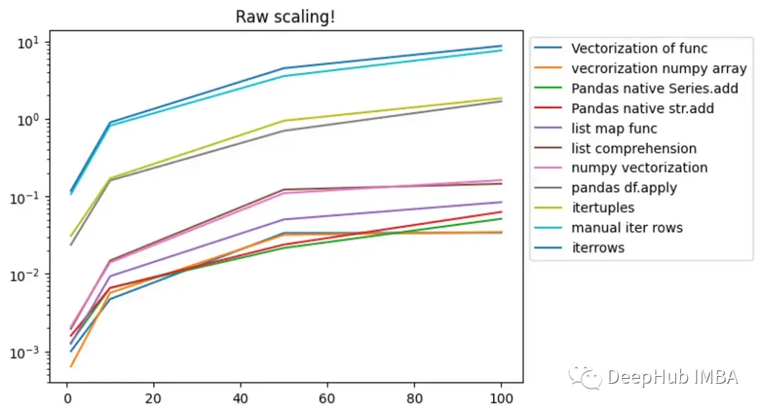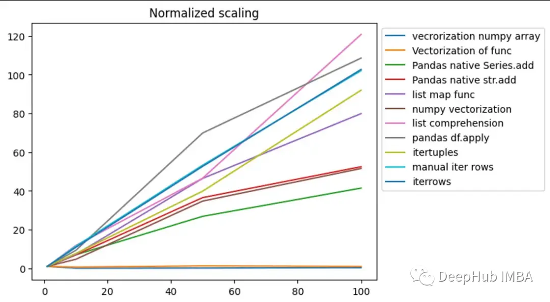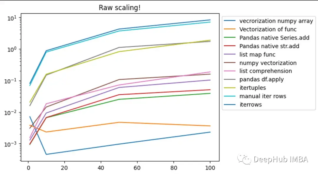 所有矢量化方法都非常快,而且pandas標準的str.add對numpy數組也進行了矢量化。能夠看到Pandas的原生方法一般都是線性的。List-map似乎以N的平方根的速度增長