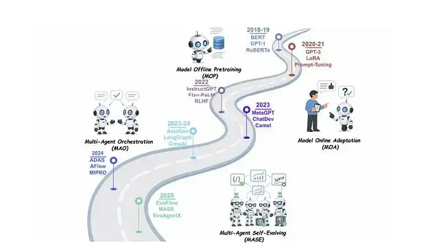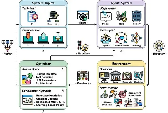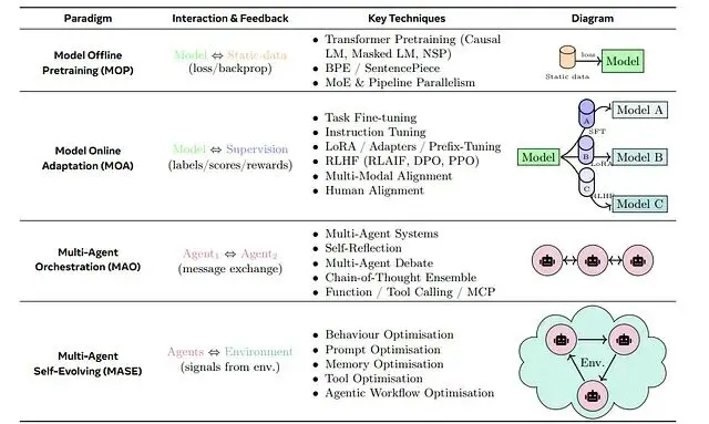這套機制把基礎模型的能力與在線學習結合起來。用更學術的表述,自我進化智能體是"通過與環境交互持續優化內部組件的自主系統,目標是適應變化的任務、上下文和資源"。比如説這類智能體不只是做題,還會批改自己的作業、找出哪裏寫錯了、然後調整學習策略,整個過程不需要人類介入。