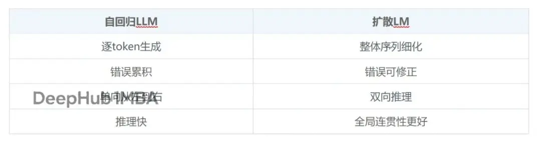 傳統自迴歸是順序生成,擴散模型的玩法不一樣:先從噪聲或者masked tokens開始,然後一步步把整個序列細化出來。它不是一個token一個token往後走,而是對整個輸出做全局優化。