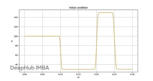 初始條件一般是空間域上的一系列離散測量點。比如1D + t(一個空間維度加時間)的情況,初始條件就是沿x軸的一串值:(0 m, 100°C), (0.01 m, 105°C), (0.02 m, 106°C), … (0.3 m, 31°C),諸如此類。