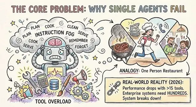 單智能體失效的核心原因有兩個:第一是"指令迷霧",提示詞一長模型就開始丟指令;第二是"工具過載",可選工具太多時,模型的選擇準確率急劇下降。