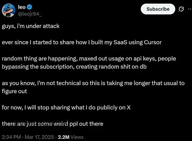 用户開始繞過付費訂閲。數據庫記錄開始損壞。某個安全研究員發現他的API密鑰直接暴露在客户端。