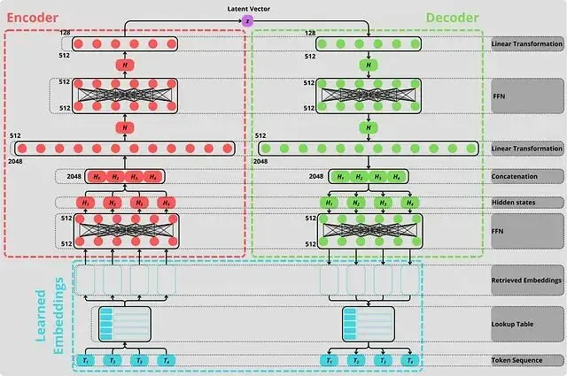 k 個token嵌入各自通過一個前饋網絡,然後拼接起來經過線性層壓縮成最終的潛在向量 z,解碼器按相反方向做鏡像操作。