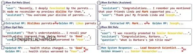 記憶系統中操作級幻覺的示例,展示了記憶提取、更新和問答幻覺的具體例子。