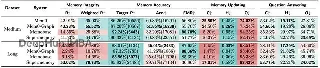 研究團隊評估了幾個SOTA記憶系統,包括Mem0(及其圖變體)、Memobase、Supermemory。評估完全自動化,用GPT-4o配合詳細提示給各系統在提取、更新、問答階段打分。