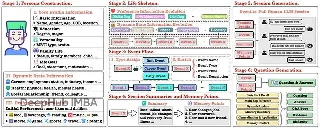 階段4:會話摘要與記憶點(Session Summaries and Memory Points):每個事件生成摘要和ground truth的記憶點。這些是完美記憶系統該提取和更新的原子級事實。工作變動事件會產生"用户升職"、"用户薪資增加"這類記憶點。