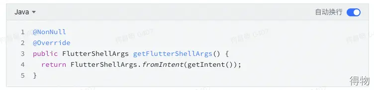 這是一個public方法,那麼我們只要在MainActivity中重寫這個方法,並在獲取到FlutterShellArgs之後將需要的配置添加進去即可: