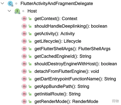 FlutterActivity也是繼承的Activity,但是它把主要的功能都委託給了FlutterActivityAndFragmentDelegate類去實現,實現的Host接口主要是支持在delegate中獲取FlutterActivity的一些參數,比如configureFlutterEngine,這些方法可以由子類去重寫,實現自定義配置。