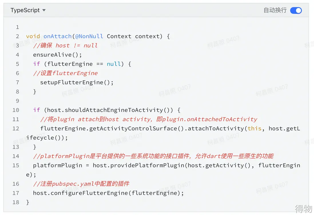 1.delegate.onAttach(this): 初始化FlutterEngine、註冊各個插件。(注意,這裏傳的this即是delegate中的host對象)