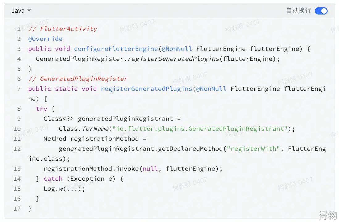 它通過反射找到了GeneratedPluginRegistrant類,並調用了其registerWith方法。這個類我們可以在工程中的 /android/java/目錄下找到,是flutter tool自動生成的,當我們在pubspec.yaml中添加一個插件,並執行pub get命令後即會生成。