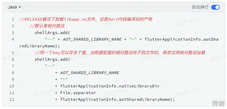那麼libapp.so是在哪裏加載的呢?其實上面 1.4.FlutterLoader 已經提到了,在ensureInitializationComplete()方法中,有一個shellArgs列表存儲了資源路徑配置信息。libapp.so對應的key是 "aot-shared-library-name"