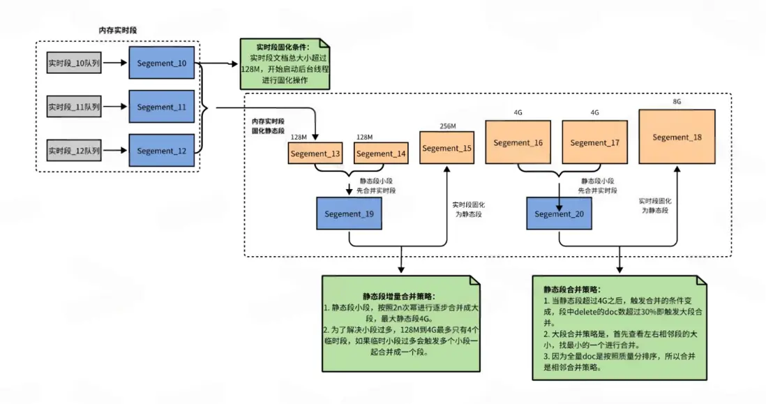 - 靜態段的合併觸發策略是當靜態段中delete的doc比例超過了30%會觸發靜態段之間的合併,合併會按照近鄰合併原則,從左右近鄰中選取一個最小doc數的段進行合併,進而新生成一個新的段。