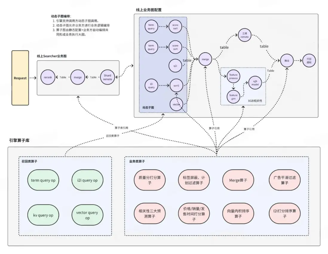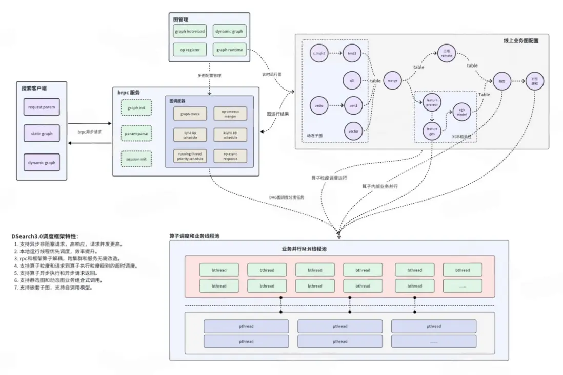 - 動態圖支持: DSsearch3.0支持動態圖編排,主要通過業務方通過動態編排請求來組織對應的算子編排邏輯,實現業務方自主編排調度邏輯,方便整體業務開發。