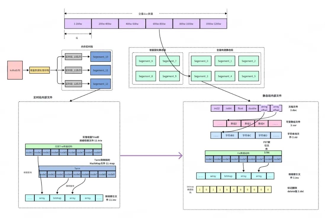 - 遍歷按整個只讀內存段,構建新的索引和新的正排結構生成新的靜態段。