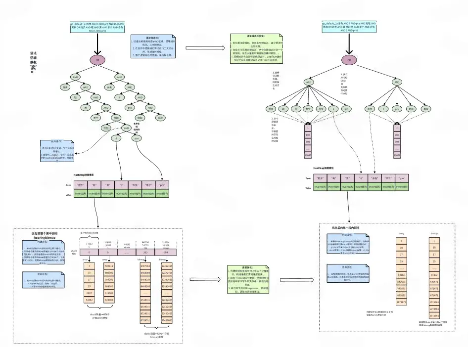 - DSearch2.0重點從邏輯語法樹和倒排入手,優化語法樹,減少合併樹高,從二叉樹合併變成單層合併。