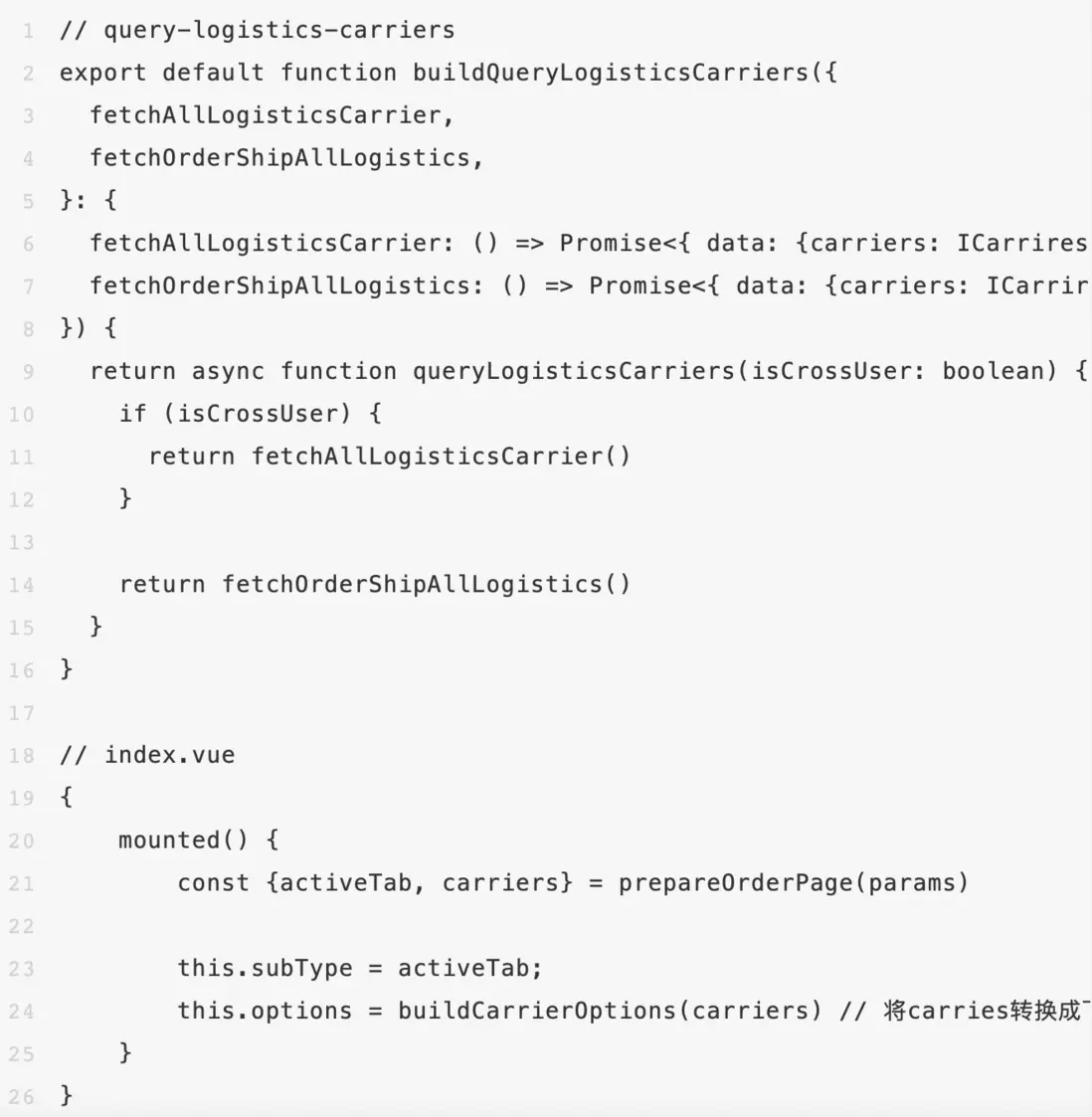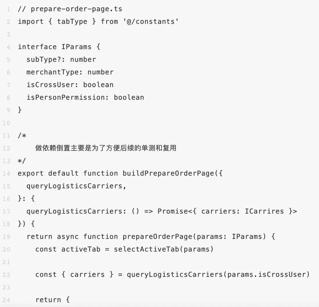 其次,prepareOrderPage usecase專門為訂單頁定製,拆分後一眼就能看出來訂單頁的準備工作需要幹決定選中的tab和拉取供應商列表兩件事情。而另一個拆分出來的queryLogisticsCarriers則是封裝了商家後台跨境、國內兩種邏輯,後續無論跨境還是國內的邏輯如何變更,其影響範圍被限制在了queryLogisticsCarriers函數,我們需要對其進行功能迴歸;而對於prepareOrderPage來説,queryLogisticsCarriers只是() => Promise<{ carriers: ICarrires }>的一個實現而已,其內部調用queryLogisticsCarriers的邏輯完全不受影響,不需要進行迴歸。