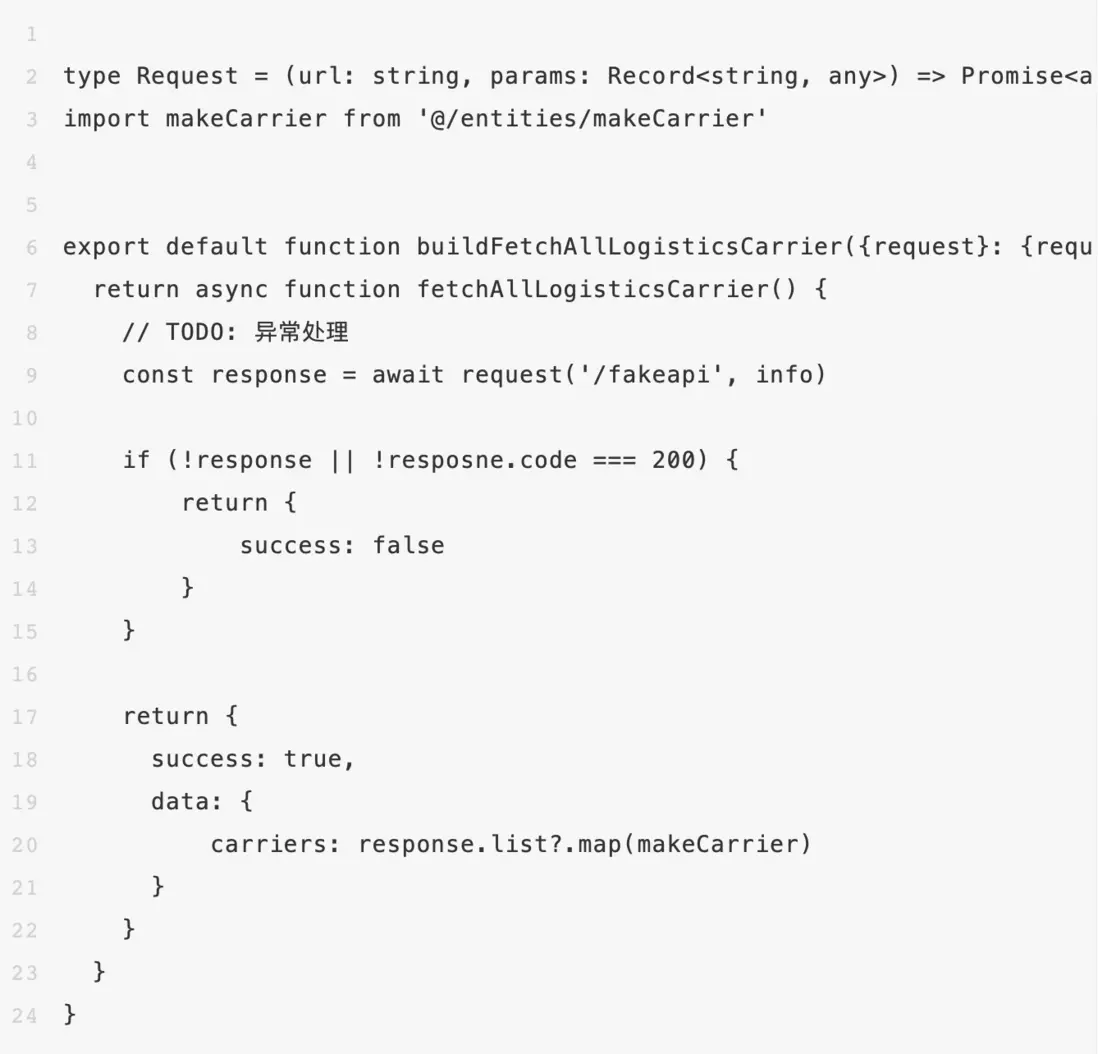 這一層很核心的一點即是可以依賴entity的工廠函數,將接口返回的數據轉化成前端自己設計的模型數據,保證流入usecase和ui層的數據都是經過處理的“乾淨數據”。除此之外,通常在這一層我們會用一種固定的數據格式返回數據,比如例子中的 {success: boolean, data?: any}。這樣做主要是為了抹平對接多個系統帶來的差異性,同時減少多人協作時的溝通成本。