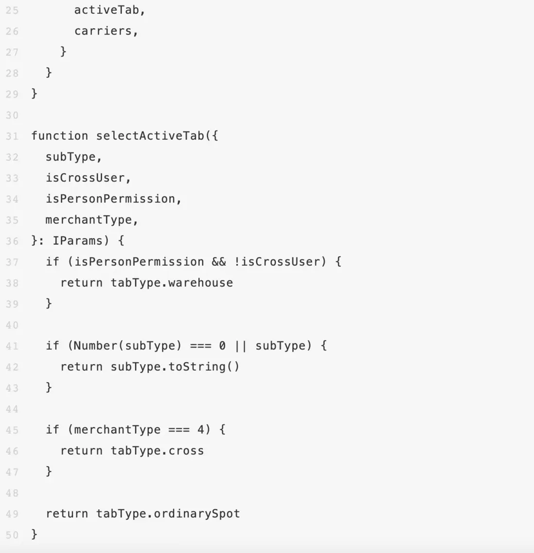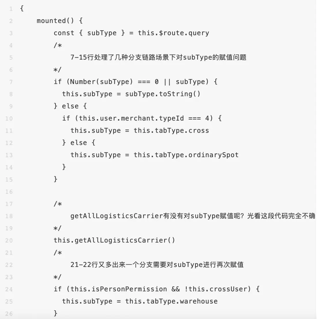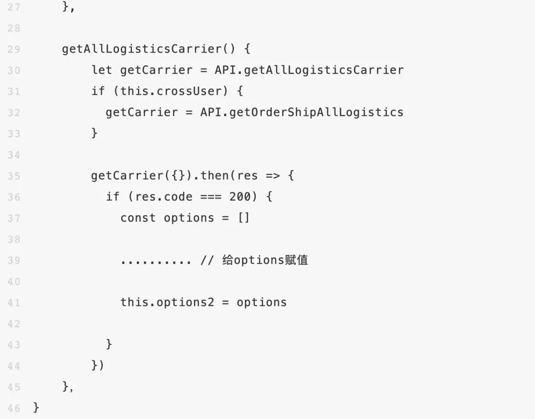 我們能看到7-15、24-125行對this.subType進行了賦值。但由於我們無法確定20行的函數是否也對this.subType進行了賦值,所以光憑mounted函數的代碼我們並不能完全確定subType的值究竟是什麼,需要跳轉到getAllLogisticsCarrier函數確認。這段代碼在這裏已經做了簡化,實際的代碼像getAllLogisticsCarrier這樣的調用還有好幾個,要想搞清楚邏輯就得把所有函數全看一遍,代碼的可讀性一般。同時,由於函數都封裝在ui組件裏,因此要想給函數覆蓋單測的話也需要一些改造。