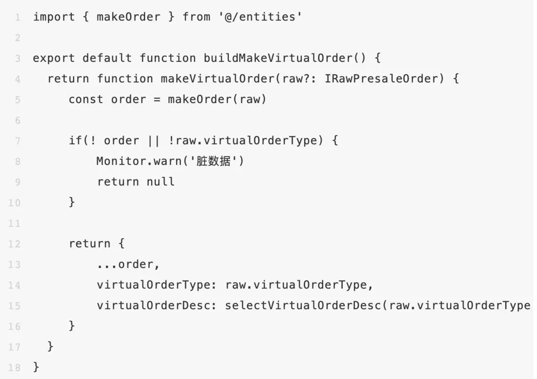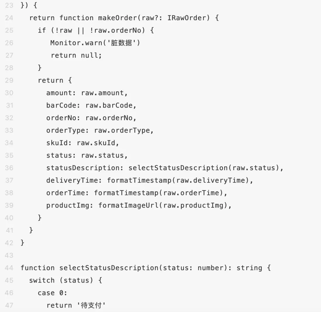 以上是商家後台訂單模型的entity工廠函數,工廠主要負責對服務端返回的生數據進行加工處理,讓其滿足渲染層和邏輯層的要求。除了抽象數據之外,可以看到在entity工廠還對數據進行了校驗,將髒數據、不符合預期的數據全部處理掉或者進行兜底(具體操作要看業務場景)。