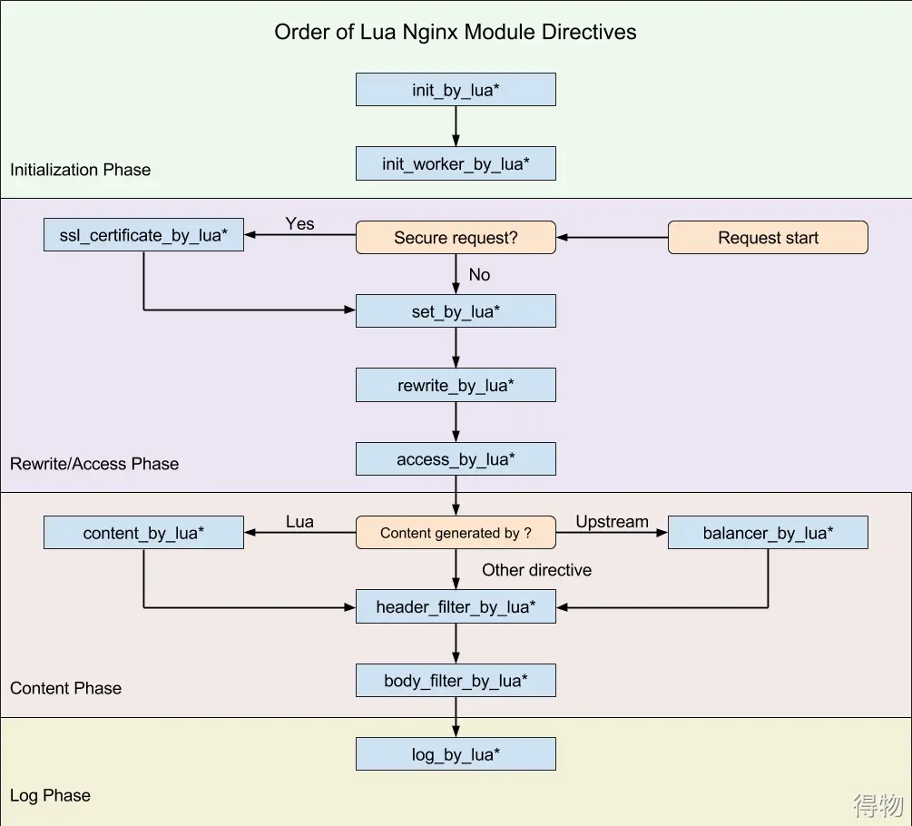 巧合的是,OpenResty 也有 11 個 *_by_lua 指令,它們和 NGINX 的11個執行階段有很大的關聯性。指令是使用Lua編寫Nginx腳本的基本構建塊,用於指定用户編寫的Lua代碼何時運行以及運行結果如何使用等。下圖顯示了不同指令的執行順序,這張圖可以幫助理清我們編寫的腳本是按照怎樣的邏輯運行的。