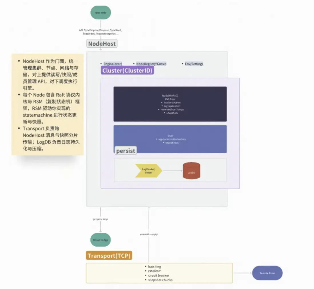 為應用屏蔽 Raft 複雜性,提供易於使用的 NodeHost 和狀態機接口。該庫(自稱)有如下特點:
