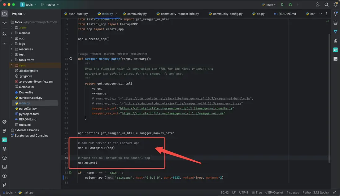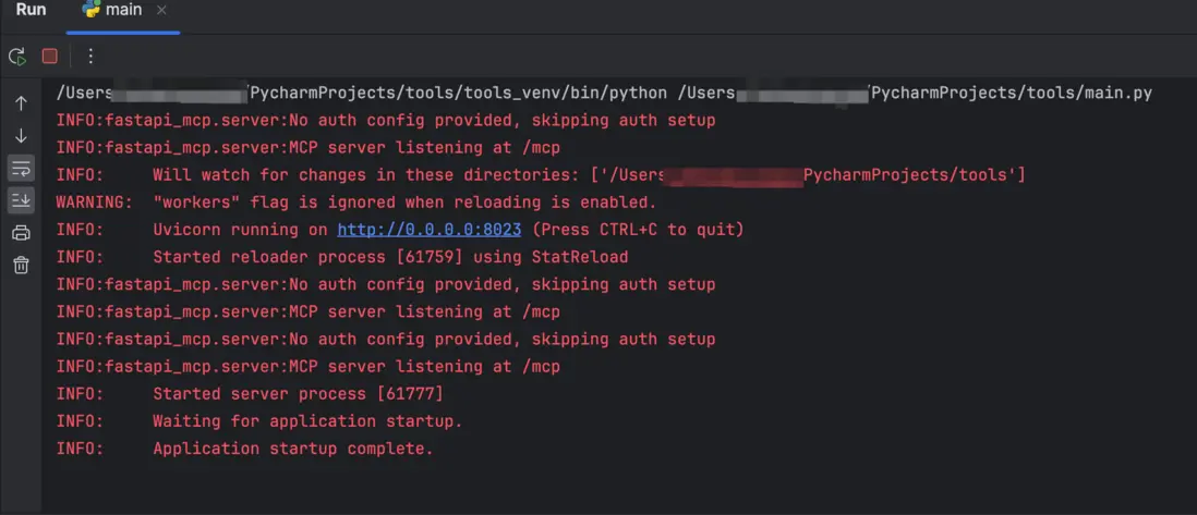 最後一步: 啓動服務 uvicorn.run('main:app', host='0.0.0.0', port=8023, reload=True, workers=2) ,無報錯基本就沒有問題了。再通過 MCP 客户端工具連接使用即可