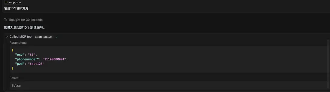 把這個造數需求發送給 AI,發現報錯了。我們去代碼中看下為何返回了 false,原來是因為接口返回非 200,排查下來是因為 t1 環境測試賬號造數默認填了 111,不需要再加 111,所以接口直接 500 了。